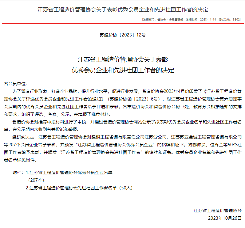 【概要描述】祝賀公司成為江蘇省工程造價管理協會優秀會員企業,祝賀公司總工辦同事嚴勤芳成為江蘇省工程造價管理協會先進社團工作者,未來繼續帶領同事們在專業上深耕,期待公司未來能夠取得更加輝煌的成就!